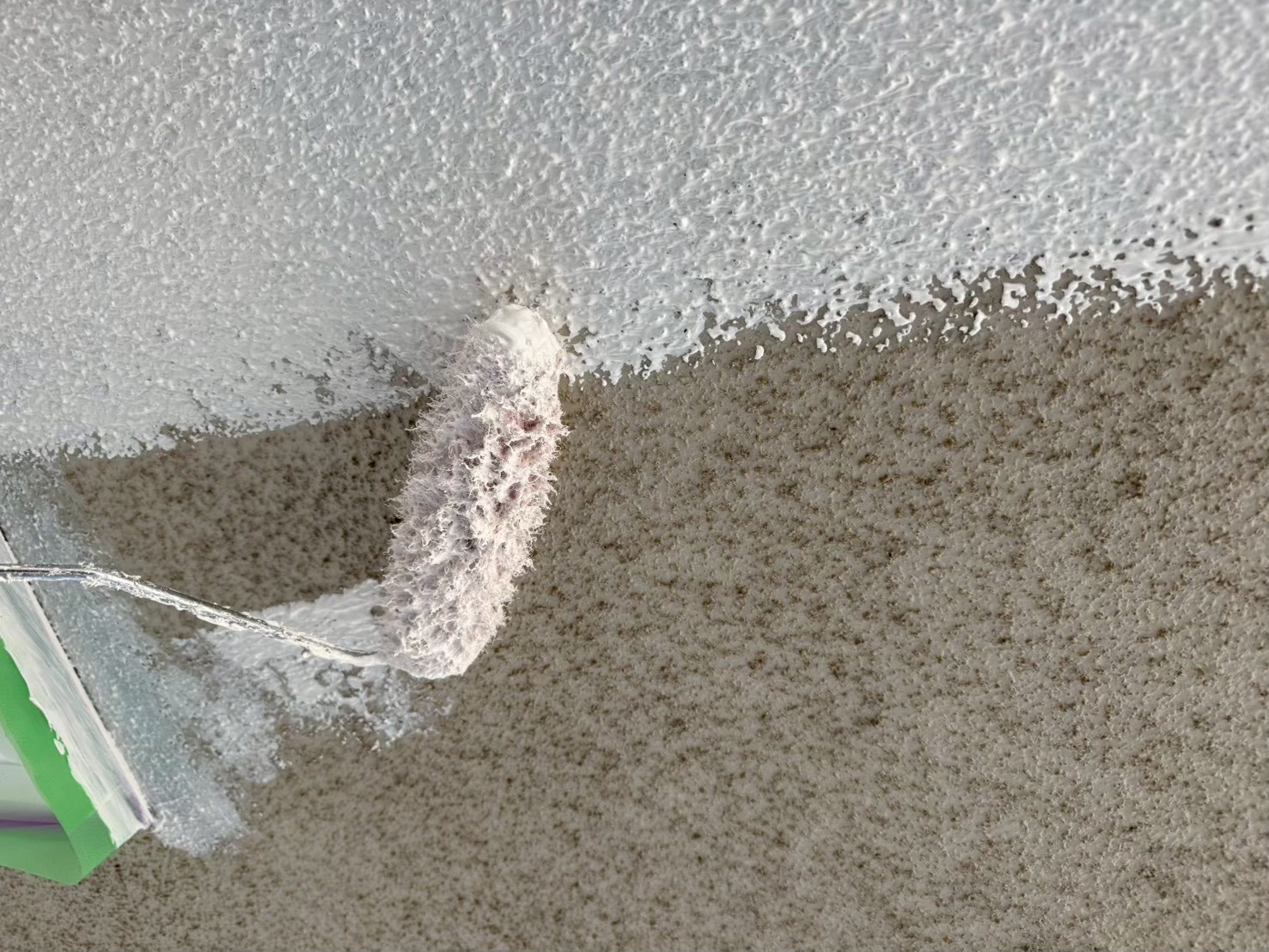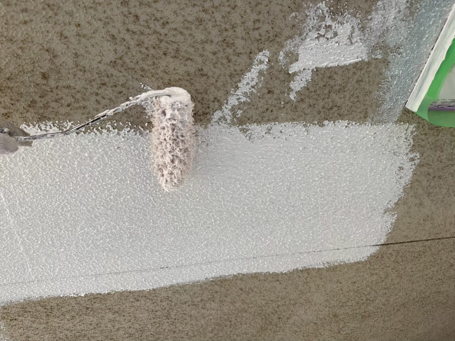 シーラーやフィラーを塗布し、上塗り塗料との接着を高めます。隅やローラーで塗りにくい箇所は刷毛で丁寧に塗ります。
