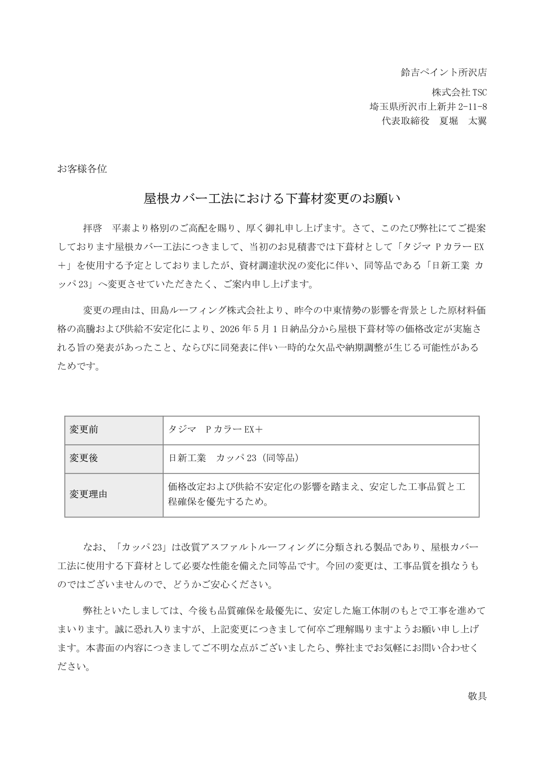この度中東情勢や様々な影響を背景とした原材料価格高騰および供給不安定化により、2026年5月1日以降屋根下葺材変更となりますのでご案内申し上げます。
