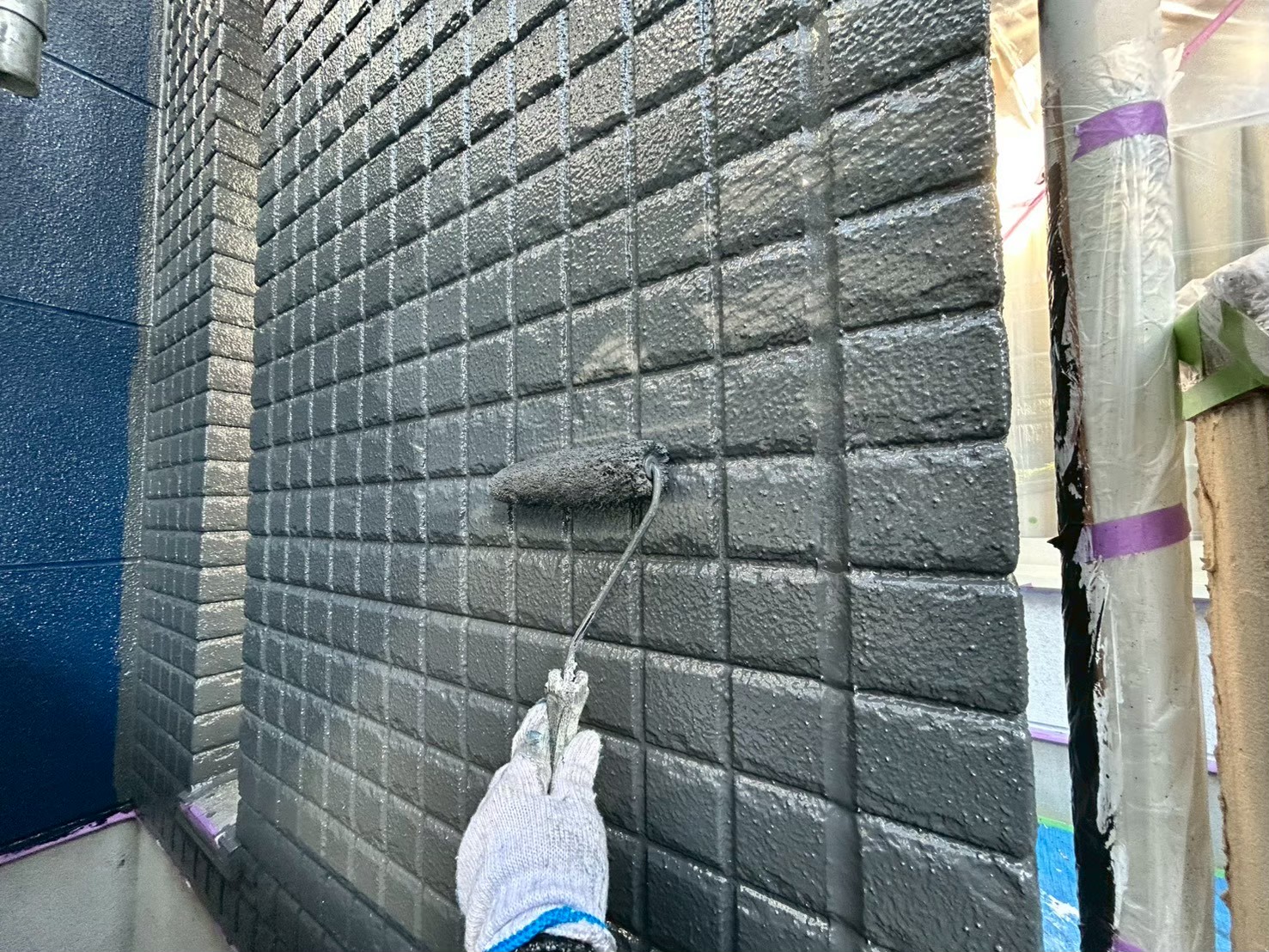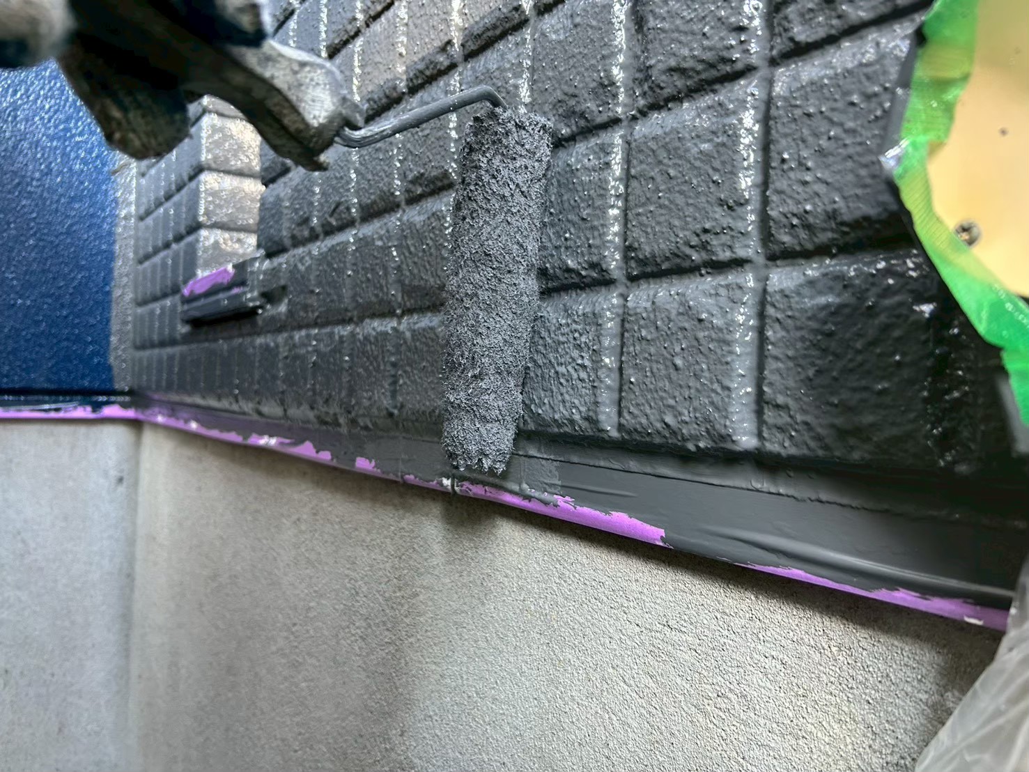 仕上げ用塗料を塗布し、下塗りとの色を変えることで塗り残しを防ぎます。塗膜の厚さを確保する重要な工程です。